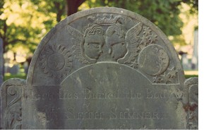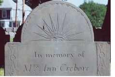 ANN CREHORE, 1797: There are several sun/horizon carvings here, symbolizing the end of life on Earth and the commencement of that which is eternal (it is setting or rising). Though the suns are often anthropomorphized, this is the only know example of a hairy sun face, which is both strange and comical.