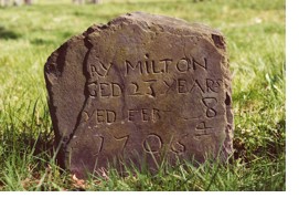 MARY MILTON, 1704/5: This is one of a very small group of early stones, simply peaked in shape and plainly lettered without decoration, found around Boston. Similar stones stand in Roxbury’s Eustis Street Burying Ground. They are crudely but competently done, and may represent someone’s first efforts at carving or a short-term occupation.