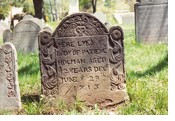 REV. JOHN WADSWORTH, 1766: The design of this stone, possibly from the workshop of James New, includes a delightfully detailed torso portrait of the deceased under the banner, “A Sudden Death.”